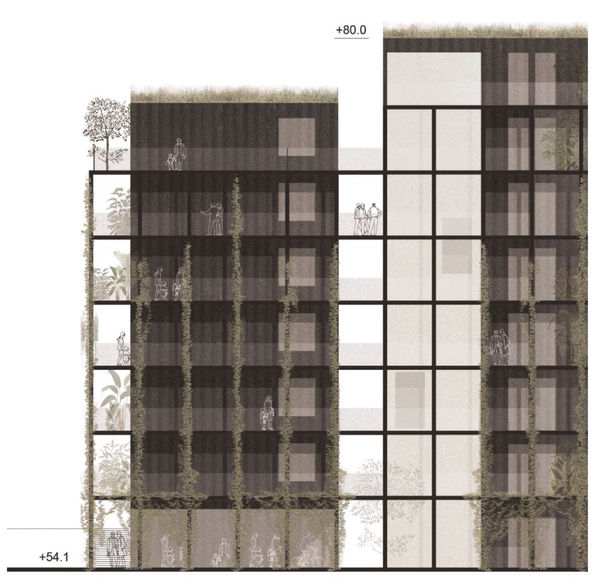 Trähusbyggandet i Göteborg har lång tradition. Nu: En gjuten grund med garage som bas för prefabricerade och lätta trämoduler. Ett lätt trägitter bär systemet av balkonger runt exteriört. Yteffektiva två- och trerummare med genomgående planlösning, egen balkong med liten vinterträdgård för samtliga. Gemensamma entrébalkonger mot gården kan samnyttjas för sitt- och lekyta, stadsodling, individuell cykelparkering... Bottenvåningar med bostäder lägenheter och gemensamhetsutrymmen. Cykelcaféet kombinerar mat och dryck med försäljning och reparationer.